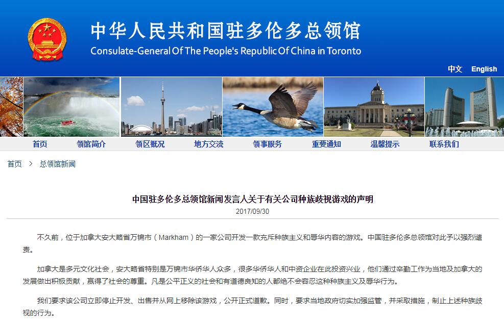 中国驻多伦多总领馆要求该公司立即停止开发、出售,并从网上移除该游戏,公开正式道歉。同时,要求当地政府切实加强监管,并采取措施,制止上述种族歧视的行为。