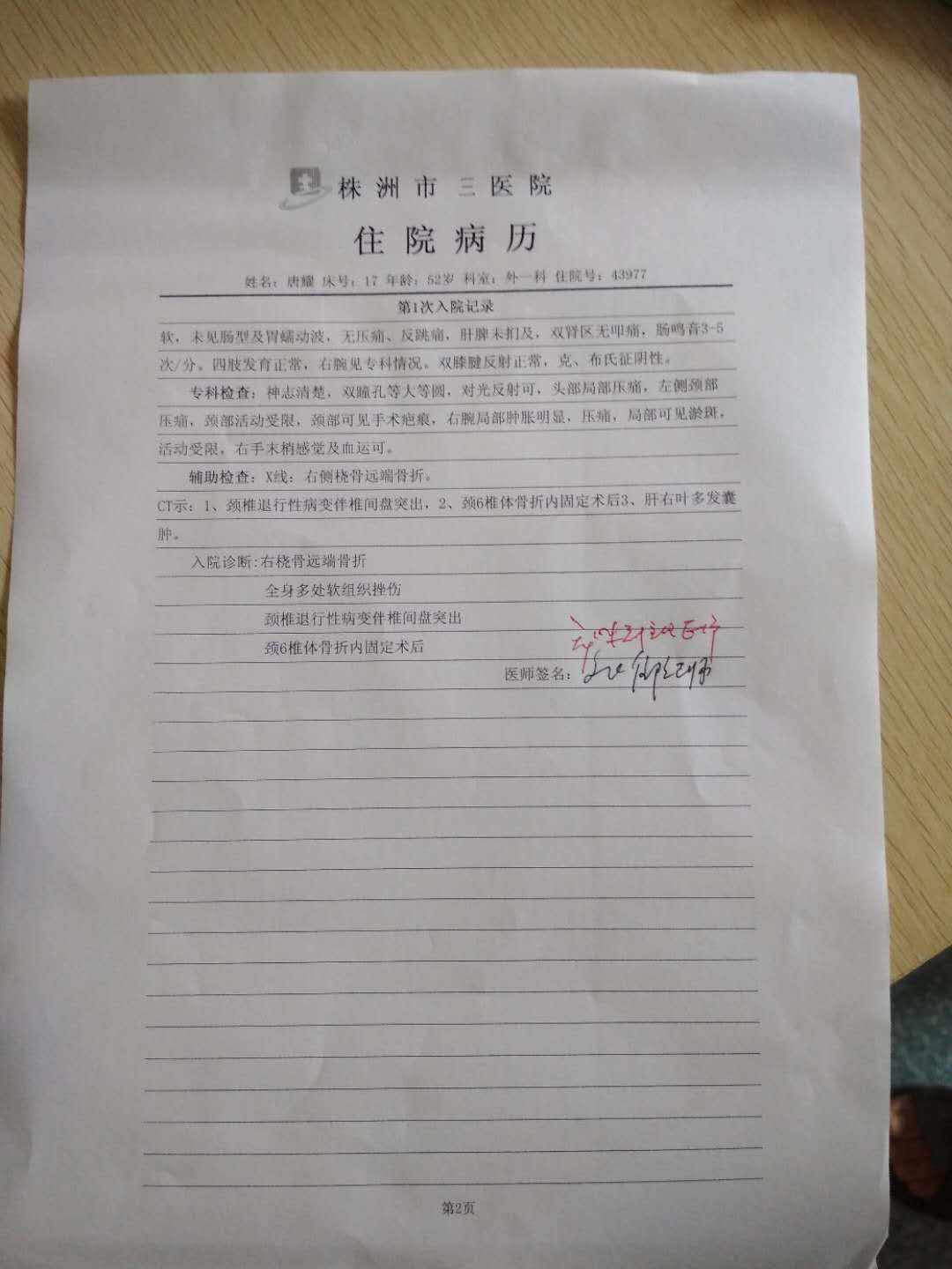 家住该市荷塘区明照街道办事处金塘村禾丰村民小组(此处距离开发商“国林宝华智能制造基地”)仅距离50米不到的位置就是杨春罗的家。因在非法开采中打顶板锚杆眼,须鸣炮碎石,致使“碎石满天飞,震动波耳鸣”;墙体出现裂缝,之型八格,房顶“百花齐放,漏洞百出”;外墙装饰脱节,室内溽燥难分。固然,于7月6日上午9点30分,唐耀女士本着维护自家的家居不再受其影响,以免造成房屋坍塌,所以在未雨绸缪之下,去与开发商的作业人员进行沟通,劝其停工。唐耀对施工人员说“房屋受损尚未解决,修缮工作仍未启动,虽然付了8000元/户,对周边房屋受损的居民家而言,这无异于杯水车薪。待房屋修缮后你们再动工!”谁知,无良黑心的开发商藏污纳垢,邀请了社会闲散人员藏匿于此处,伺机镇压合理合法受损维权的善良群众。在须臾间,四名虎背熊腰,彪形大汉,不问青红皂白,对一个手无寸铁,毫无缚鸡之力的孱弱之妇大打出手!(注:诊断结果附表)与此同时,唐耀的小叔子(其夫的胞弟杨葛)在家闻讯后,仅只说了一句:“凭什么打人?!”并惨遭毒打!幸亏本组村民及时赶到,才避免了含恨九泉的悲剧发生。
