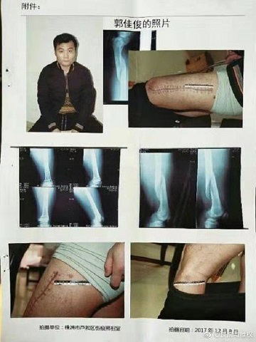 郭建德接着说,遭暴力强拆的头天晚上,我儿媳在医院分娩,儿子在陪护。次日早晨,我儿子与我联系,因他不知我的手机被不明身份的人没收了(在此籍此一笺,我身上当时有一千多块钱现金、还有车钥匙也不知去向),他回家拿婴儿的衣服,离家只有四五十米远的距离时,强拆队伍的人群中突然间有人大喊:“郭建德的崽回家了,搞死他!”随后二三十人将他团团围住,其中一个用灭火器喷射我儿子双眼,五六个人蜂拥而上,棍棒相向、暴戾恣睢,经司法鉴定为轻伤一级。